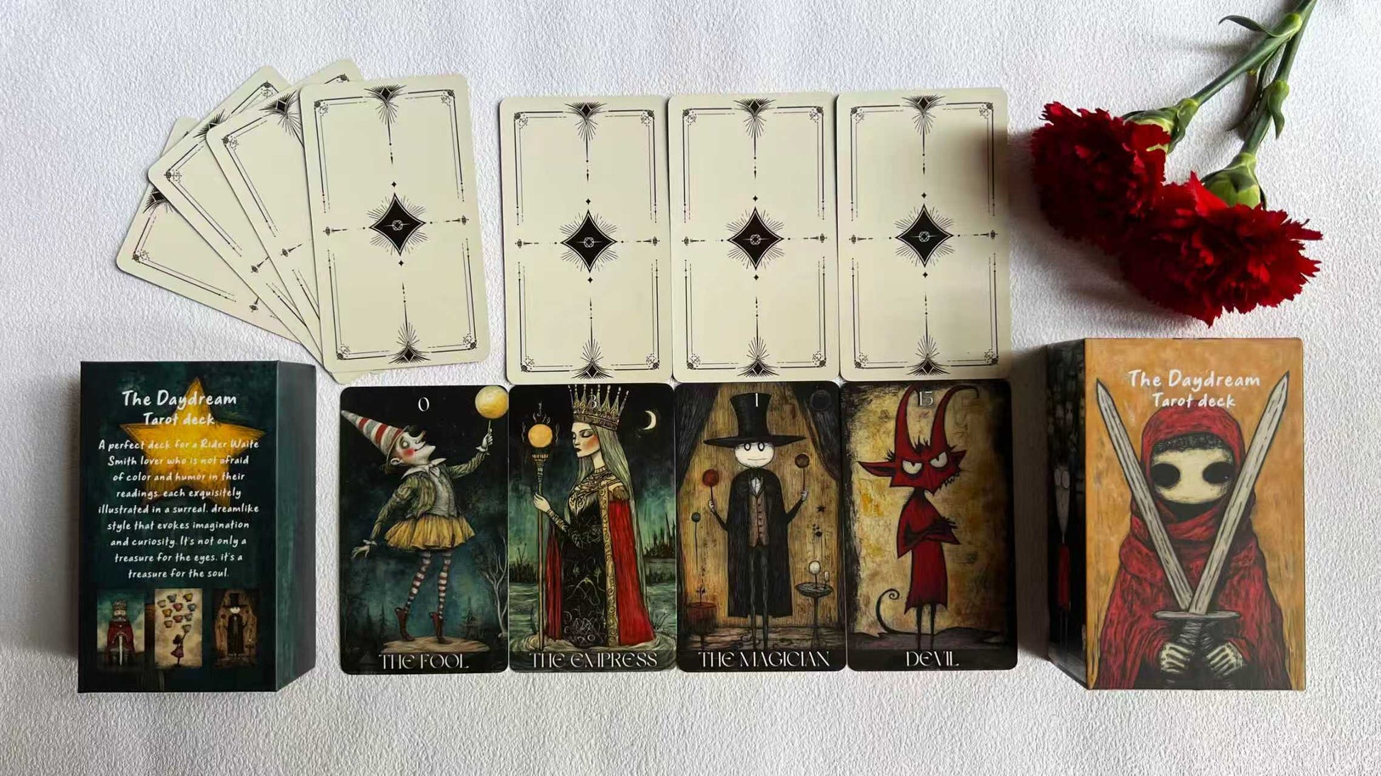 - Daydream Tarot Cards: Immerse yourself in the whimsical mysticism of The Daydream Tarot Deck. This comprehensive collection comprises a full set of 78 tarot cards, including all 22 Major Arcana, 40 Minor Arcana, and 16 Court Cards, each exquisitely illustrated in a surreal, dreamlike style that evokes imagination and curiosity. Step into the surreal realm of The Daydream Tarot Deck – embrace the magic and mystery of your dreams